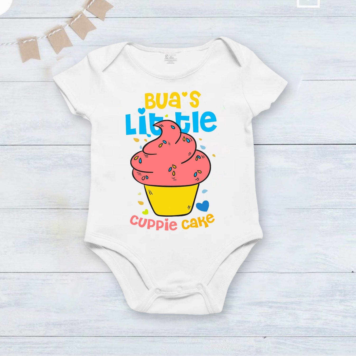 Print can be: “Custom text ” + “Photo ” + ” Baby name ”