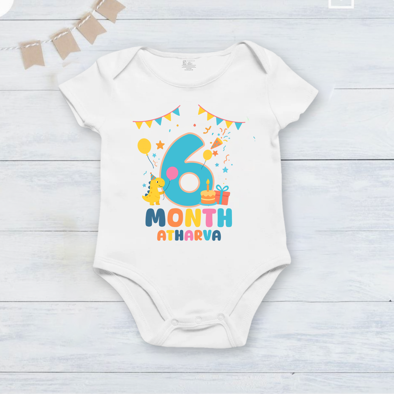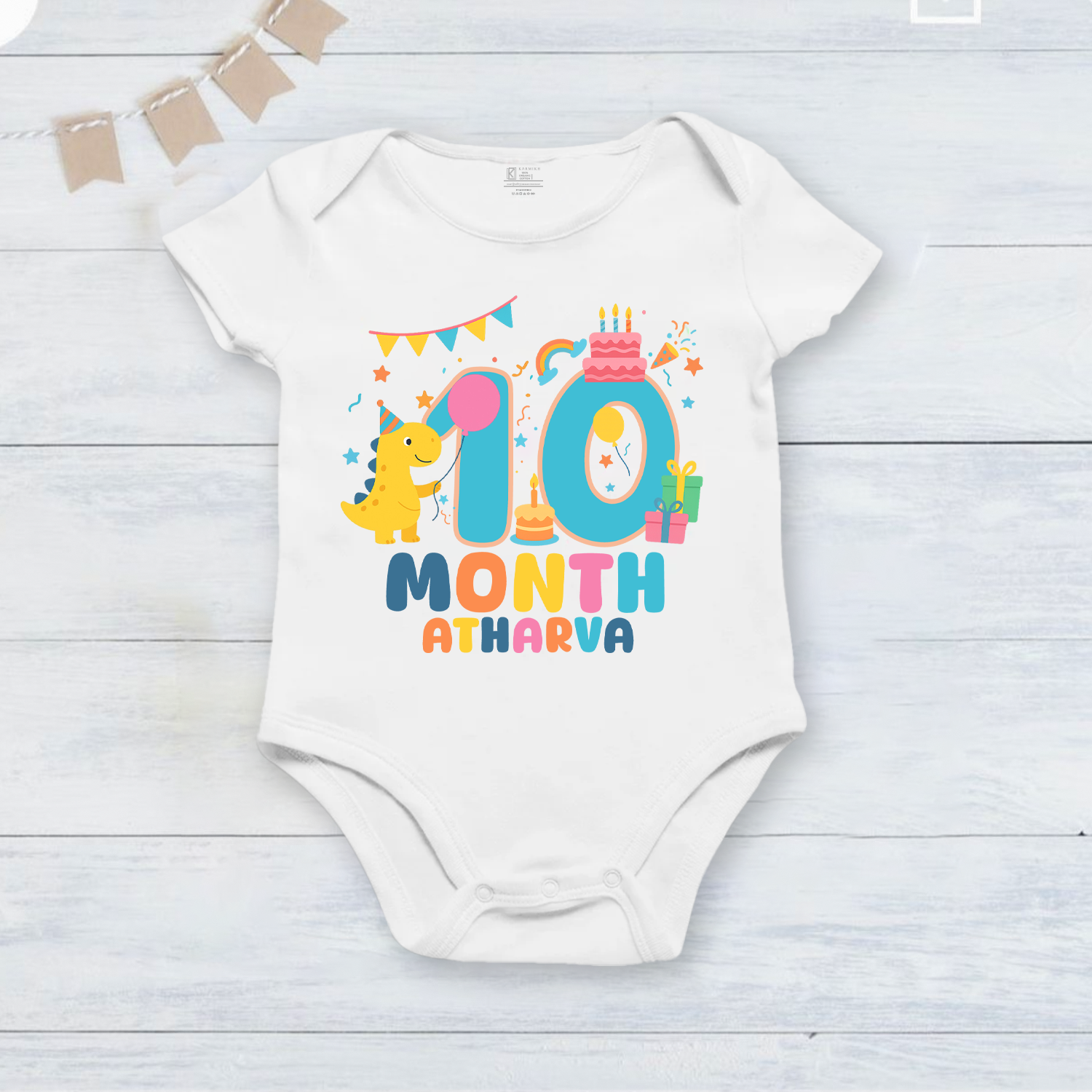 Infant monthly birthday Dinosaur 12 Months of Love_ Customized name White Onesie