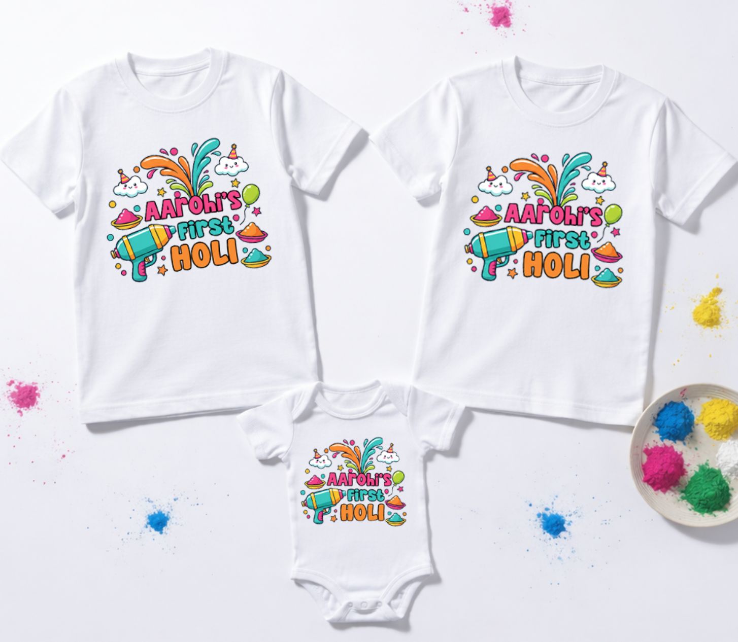 Matching My First Holi Family T-Shirts | Personalized Baby Name Cotton Set