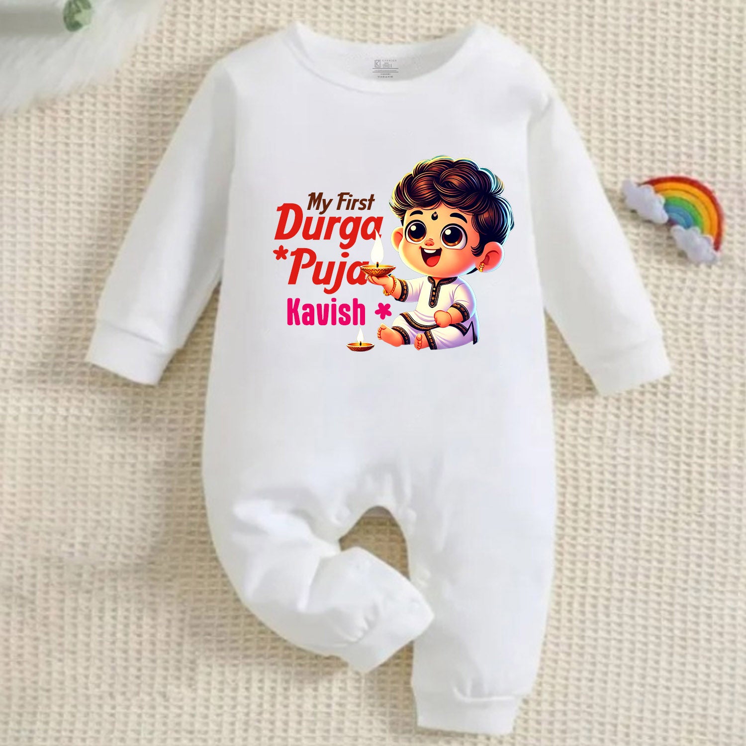 My First Durga Pooja With Customized Baby Boy Name _ Full White Romper