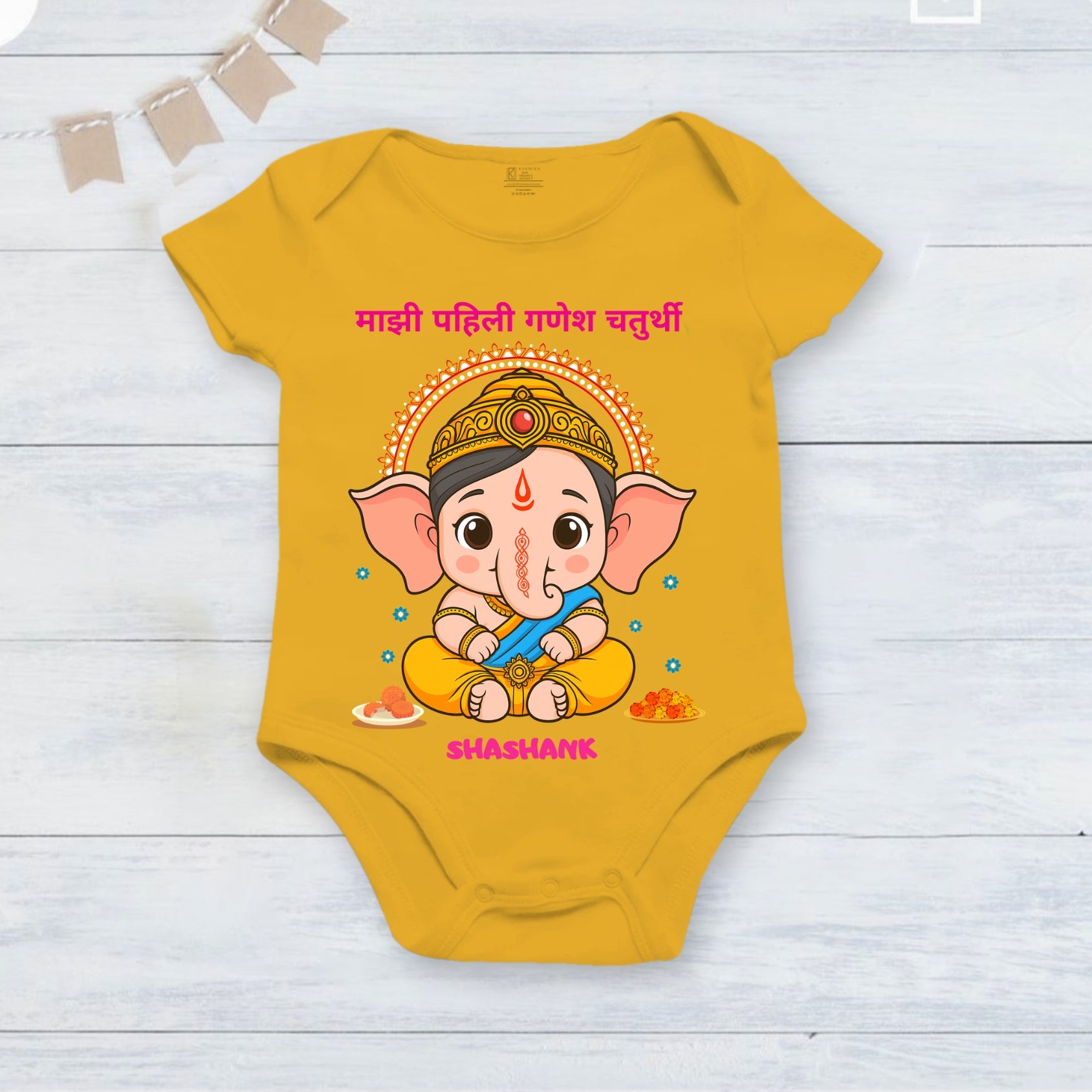 My First Ganesh Chaturthi in Marathi with customised name_ Yellow Onesie