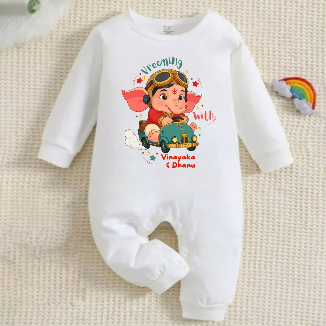 Vrooming with Vinayaka with customised name_ Full White Romper